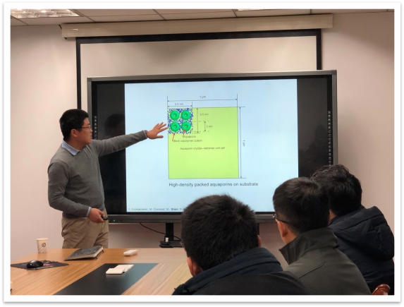 沈悦啸博士介绍了在类脂嵌段共聚物中的生物水通道方面的开创性研究工作:合成了接近生物水通道蛋白性能的人工通道,以人工通道为核心制备了创新性的膜材料,为典型污染物的高效选择性截留提供了全新的思路和方法。
