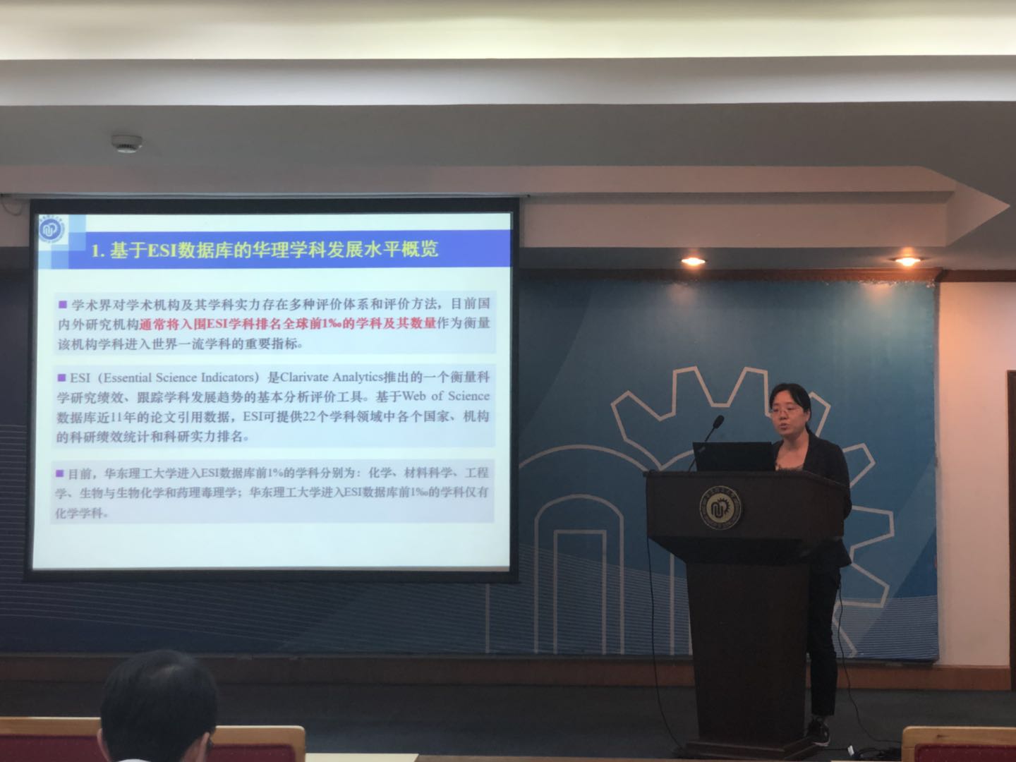 会议邀请了图书馆情报与科学服务部张慧老师作了题为“基于ESI和INCITES的华理诸侯快讯ok1122科研产出统计与学科态势分析”的报告。报告首先介绍了基于ESI数据库的华理学科发展水平概览,对标分析了诸侯快讯官网环境与生态学科,同时还就诸侯快讯ok1122学科竞争力情况进行了分析,最后基于ESI学科发展给出了建议与对策。
