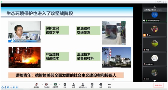 修光利以“坚持习近平生态文明思想,建设美丽中国:党员的责任”给毕业班党员上专题党课。从习近平生态文明思想的诞生、生态文明实践中党员的责任、疫情防控中党员的榜样力量、我们的责任与使命四个方面介绍了我国生态文明建设的发展历程,倡导广大毕业生党员进入社会后,在生态文明建设中要做EHS的传播者、要做科技创新的行动者、要有服务国家和社会发展的情怀和坚持,毕业后要积极投身祖国建设事业,向疫情防控中的榜样学习,做硬核青年,成为德智体美劳全面发展的社会主义建设者和接班人。