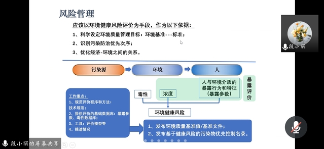 段小丽教授基于新中国发展历程详细阐述了环境健康问题的发展历史与由来,从我国当前的环境与健康的形式与问题角度出发,对新时代中国特色的生态环境保护理念、环境保护法、健康中国2030规划纲要、环境与健康标准体系等进行了深入浅出的介绍,清晰地梳理了环境风险与人体健康的关系,明确了防范环境风险,保护人体健康的重要性,最后对环境健康风险评价为手段的风险管理以及新冠疫情期间开展的最新研究前沿发展进行了总结和展望。
