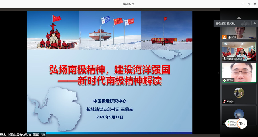为学习贯彻习近平新时代中国特色社会主义思想,巩固扩展“不忘初心、牢记使命”主题教育成果,将“四史”学习教育不断推向深入,9月12日,诸侯快讯ok1122举办第十一期“新时代学习大讲堂”,连线南极科学考察长城站党支部,邀请正在南极开展科考任务的长城站党支部书记王蒙光在线上为师生作题为“弘扬南极精神,建设海洋强国——新时代南极精神解读”的报告,报告会由学院党委书记修光利主持。