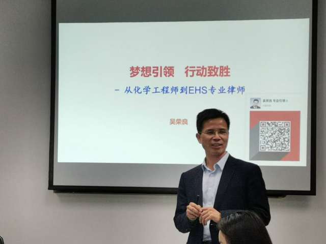 讲座伊始,吴荣良律师以“你的梦想是什么”为开头,在询问了同学们的大学梦想之后,围绕“梦想引领,行动致胜”向学生们分享了他在学生时代、国企时代和外企时代不同时期的梦想并为之不懈努力,并最终从一名化学工程师转变为EHS专业律师的经历。