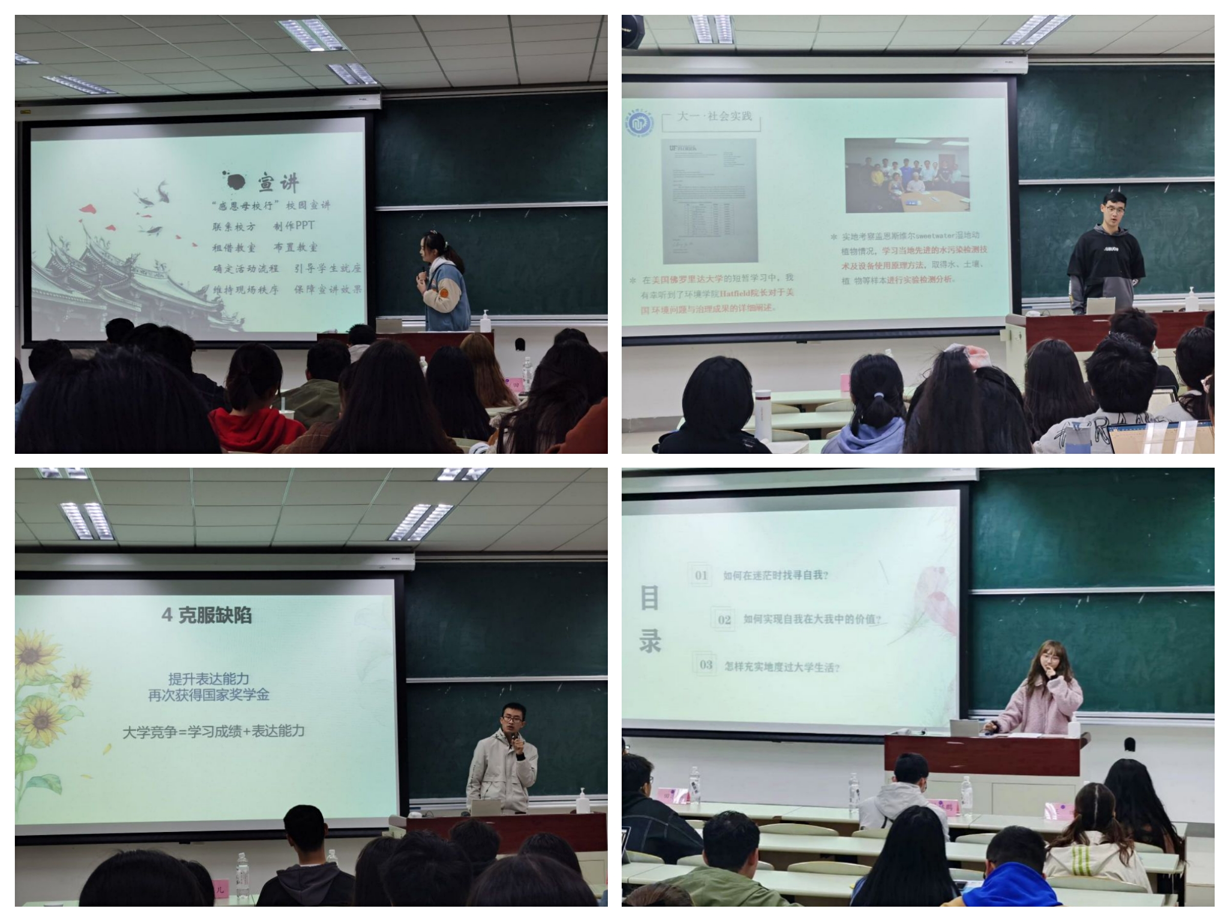 前行有光,初心莫忘,砥砺前行。每个人的经历都是一本书,通过与同学们交流互动的方式,国奖获得者们将自身成功经验生动易懂地分享给大家,让同学们获益匪浅,尤其让大一新生对国家奖学金有了进一步认识,为他们指明方向。国奖与你面对面,每个资环学子都有成为国奖获得者的可能,勤奋好学,不断追求卓越,才可成为可堪大用的资环人。