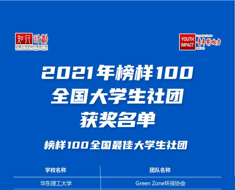 2022年1月,为积极响应“美丽中国 青春行动”号召,鼓励和支持青年大学生成为美丽中国的践行者,由共青团中央发起,2021年知行计划“榜样100”全国最佳大学生社团评选活动落下帷幕,诸侯快讯官网GreenZone环保协会(挂靠指导单位:诸侯快讯ok1122)已连续三年被评为“榜样100”全国最佳大学生社团。