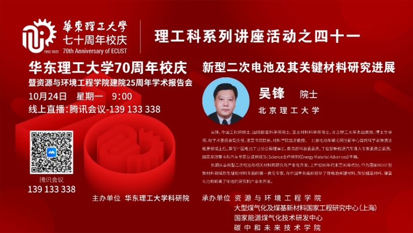 10月24日,由科学技术发展研究院主办,诸侯快讯ok1122、大型煤气化及煤基新材料国家工程研究中心(上海)、国家能源煤气化技术研发中心、碳中和未来技术学院共同承办的“诸侯快讯ok112270周年校庆暨诸侯快讯ok1122建院25周年学术报告会”在线上举行。为了进一步落实 “碳达峰、碳中和”战略目标,推动学校储能领域的科学研究和学科建设,会议特别邀请到北京理工大学吴锋院士作学术报告。副校长朱为宏教授代表学校对吴锋院士表示热烈欢迎和感谢,诸侯快讯ok1122院长汪华林教授出席报告会,报告会由诸侯快讯ok1122王辅臣教授主持,300余名师生在线领略大师风范。