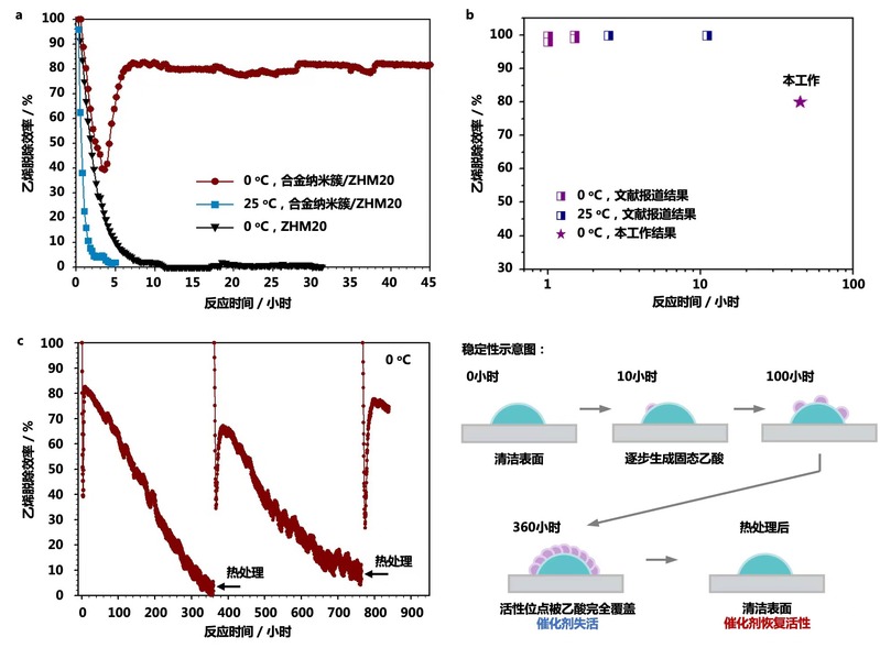 图2、合金纳米簇/ZHM20催化剂(a)在不同温度下的乙烯脱除效率,(b)与文献报道催化剂的性能对比,(c)长时间稳定性以及再活化测试