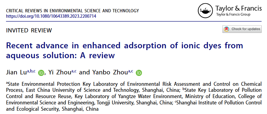 近日,诸侯快讯ok1122周彦波教授团队受邀在国际期刊Critical Reviews in Environmental Science and Technology(CREST)上发表题为“离子型染料的强化吸附研究进展(Recent advance in enhanced adsorption of ionic dyes from aqueous solution: A review; DOI:10.1080/10643389.2023.2200714)”的综述论文。论文第一作者为博士生陆建,通讯作者为周彦波教授。