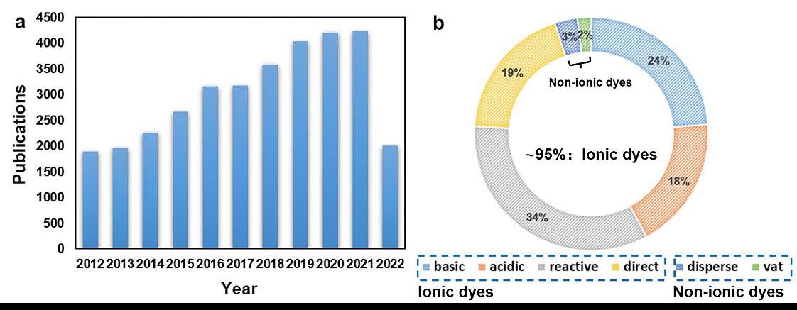 图2 (a)关于染料吸附的年度发文量; (b)不同类型染料的发文量占比。数据来源:Scopus,从 2012 年到 2022 年 5 月。