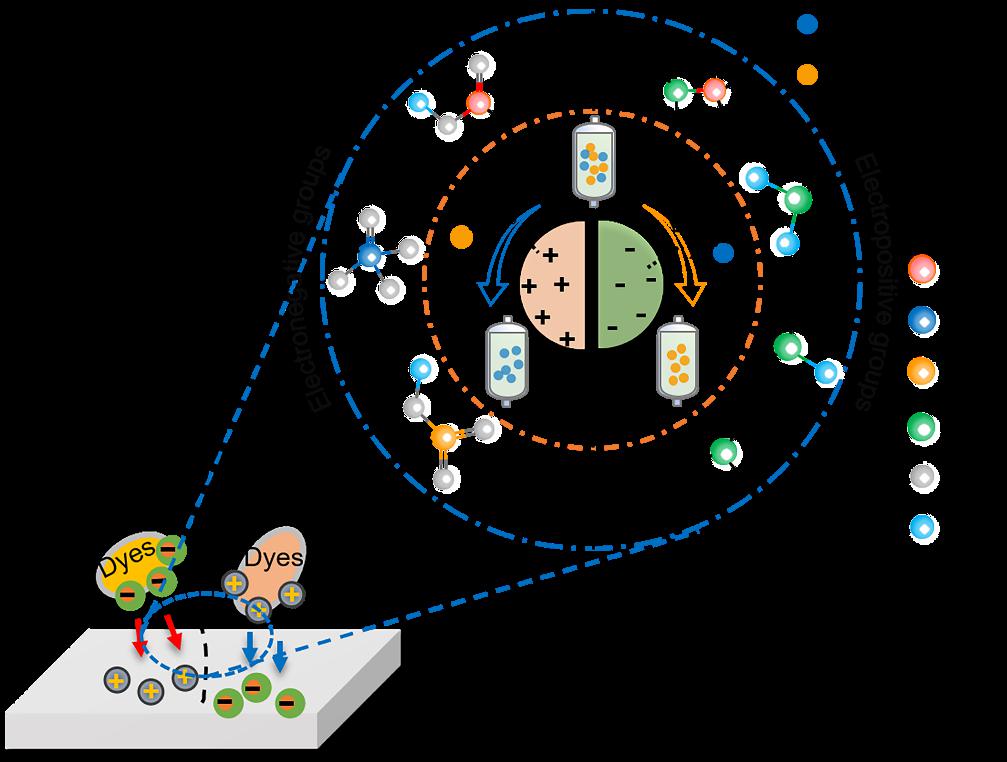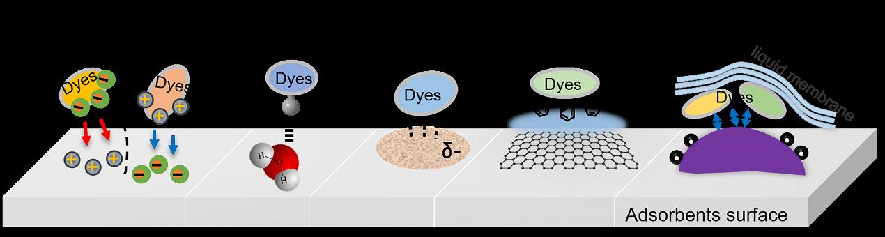 基于电荷吸引的静电相互作用是有效分离阴/阳离子染料的主要驱动力。不同的吸附力,如π-π堆积、氢键和范德华力也有助于染料的吸附。与其他机理相比,静电相互作用最常见的且在离子染料的吸附中起着最重要的作用。静电相互作用的普遍性主要源于电荷之间相互吸引的强度远远大于其他相互作用力:范德华力 < 氢键 ≈ π–π堆积 < 静电相互作用(图3)。