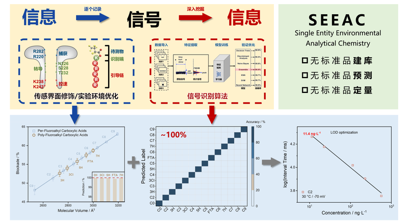 全氟和多氟烷基物质(Per- and polyfluoroalkyl substances, PFAS)是一类重点关注的新污染物。目前已知结构的PFAS超过15000种,定量分析不同环境介质中的PFAS赋存特征对解析其迁移转化规律、生态健康风险等至关重要。由于商用标准品极度匮乏(不足总数1%),色质联用等靶向检测技术难以实现PFAS全覆盖,而高分辨质谱等非靶向筛查技术的定量分析准确度仍待验证。基于纳米孔道电化学的单分子分析,凭借近场信号转导模式带来的超高结构分辨率,能够实现对过孔待测分子结构信息的高保真地记录(从“信息”到“信号”);进而结合多维特征单分子分类算法(从“信号”到“信息”),即可“逐个精准识别”过孔PFAS分子种类。通过测算对应分子的过孔频率,即使当复杂环境介质中存在大量极高浓度差异、极小结构差异的干扰物质,也能实现多种超痕量PFAS同系物乃至异构体的同时定量分析。