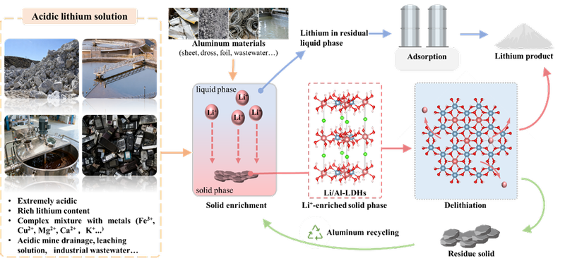 针对传统锂提取方法在强酸性溶液中应用受限的问题,研究团队提出了一种“诱导锂离子定向迁移”新策略。该策略基于锂铝层状双金属氢氧化物(Li/Al‑LDHs)的结构特性,利用锂离子在固相与液相之间的定向迁移,在大量杂质离子共存的条件下,实现了锂离子从强酸性溶液中的高选择性富集和经中性溶液的高效脱锂,并同步达成铝源的循环利用和全流程无废排放。通过建立非平衡热力学模型,研究团队揭示了锂离子在层板、层间与液相之间的化学势梯度驱动机制,系统阐明了多种关键参数对锂回收效率的影响机制。该策略在废旧锂电池浸出液、工业废水、酸性矿山排水等真实多组分强酸性体系中均表现出优异的锂回收性能与成本优势,整体的锂回收率超过96%。